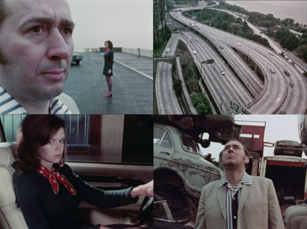 Crash the novel has its origins in “Crash!” the story that formed part of Ballard’s collection of condensed novels, The Atrocity Exhibition (1970). Written in 1968, “Crash!” takes the form of the sort of scientific report that Vaughan, the obsessive character from the novel, would have either written himself, or would have had a supply of xeroxed copies of, to hand out to prospective co-obsessives. It led to an April 1970 exhibition of crashed cars that Ballard arranged at the New Arts Lab, a gallery and former pharmaceutical warehouse in London whose proper name, as if this wasn’t all Ballardian/Cronenbergian enough, was the Institute for Research in Art and Technology. After that, in 1971, BBC2 broadcast a short film also called “Crash!” (at 8:30p.m. on Friday 12 February—just before the watershed), featuring Ballard driving around the sort of roads that would form the backdrop for his novel, perusing cars both new and wrecked, accompanied/haunted by a young woman played by Gabrielle Drake. (Who was best known at the time as the purple-wigged Lt. Gay Ellis in Gerry Anderson’s UFO. She was also the sister of ill-fated folk singer Nick Drake, and may have bonded a little with Ballard as she, too, was born out east—in Lahore—and lived in Burma before coming back to England as a child. She evidently made an impression, as Ballard apparently mentioned her by name in an early draft of the novel, as one of the celebrities the obsessive Vaughan was pursuing. Her name lingered in the published version as one of Vaughan’s clique.)
