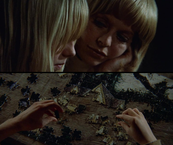In Robert Altman’s 1972 film Images, Susannah York plays a woman whose life is invaded by a series of ghosts/doubles/hallucinations when she spends time alone at a remote house in Ireland. It starts with a mysterious phone call, where an unknown person implies her husband is having an affair—but the voice on the other end of the phone is her own. A man with whom she’d had an affair years ago suddenly appears, but he died three years ago. Going for a walk and looking back from across a lake, she sees herself entering the house. The filmmakers start playing games: the daughter, Susannah, of her husband’s friend is played by Cathryn Harrison, while Susannah York is playing a woman called Cathryn. In one scene, the two—with their identical long blonde hair—sit together to complete a jigsaw puzzle, Cathryn with her left hand on the left, Susannah with her right hand on the right. It all has echoes of Bergman’s Persona (1966), and more than a touch of Polanski’s Repulsion (1965). But does it all mean something, or are the filmmakers just providing a series of shocks, playing with significances? Well, you won’t find the answer to that question here. I’m going to look at another aspect of the film.