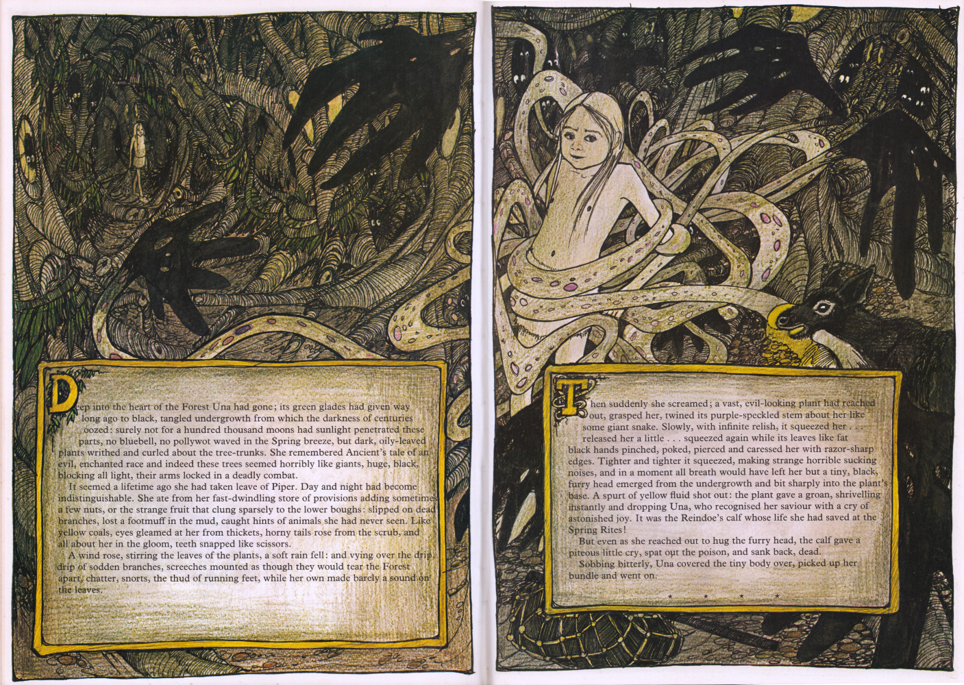The 1974 edition of In Search of Unicorns was illustrated by Wendy Hall (who said York had very clear ideas on how the characters should look, as many of them were based on her friends and family). It was later revised and re-illustrated by Pat Ludlow in 1984, and I suspect one of the reasons (though I haven’t seen it) for the new illustrations would be that Una spends most of the first half of the book entirely naked (perhaps inspired by that John Bauer image), and that might have been changed as the hippie-ness of child nudity became less acceptable. (I also wonder if one of the revisions might have been to get rid of the line: “Hero was rather partial to ladychildren, especially if they looked small and fragile”.)