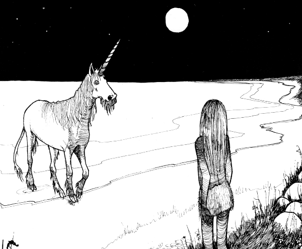 Una, and a unicorn on its fourth coffee. Art by Wendy Hall
