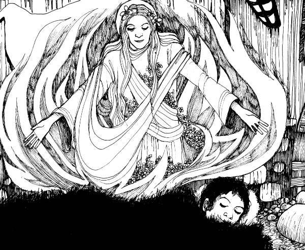 A sleeping Hero is visited by the Spirit of the Universe. Art by Wendy Hall.