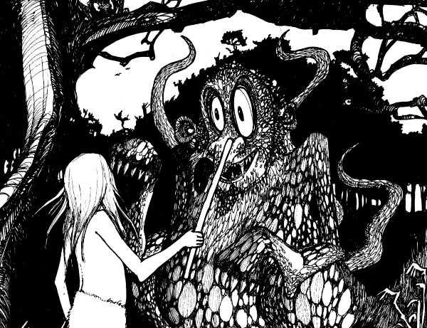 All in a night, spring came, rushing from beyond the ends of the earth and spilling out all over Umberny, its sack full of colours, and buds and birds’ eggs, snails and tadpoles, rainbows and newborn animals. Bees hummed, mammoths gambolled, meadows rang with the plighting of troths, and deep in his ancestral cave Hero Fairbeard Frisky, Lord of all Ums, snored and grunted, stirred and groaned, and got out of bed to look outside. “Fiddle-fuddle, Umb! A thousand spitting curses!”