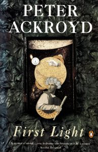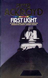 While Powys’s tone and style in A Glastonbury Romance embrace every character and story, and pass effortlessly into his characters’ deepest thoughts and feelings, Ackroyd’s style in First Light seems to have two starkly different modes. He has a light, distant, satirical tone when dealing with this more comical characters, such as Evangeline, the Mints, Augustine and Brenda. But three of his characters—Mark, Kathleen, and Damian—are loaded with melancholy, and when we’re with them, it’s a heavy, elegiac tone that takes over. It’s as though the one genuine feeling of any depth Ackroyd is presenting us with is sadness; anything else is light and flighty and ironic. (Oddly, both tones work. The melancholy chapters can be genuinely moving, and the comic chapters can be amusing—I’d never say laugh-out-loud funny, but certainly amusing. It’s just odd to find these two tones, and nothing between, existing together in the same novel.)